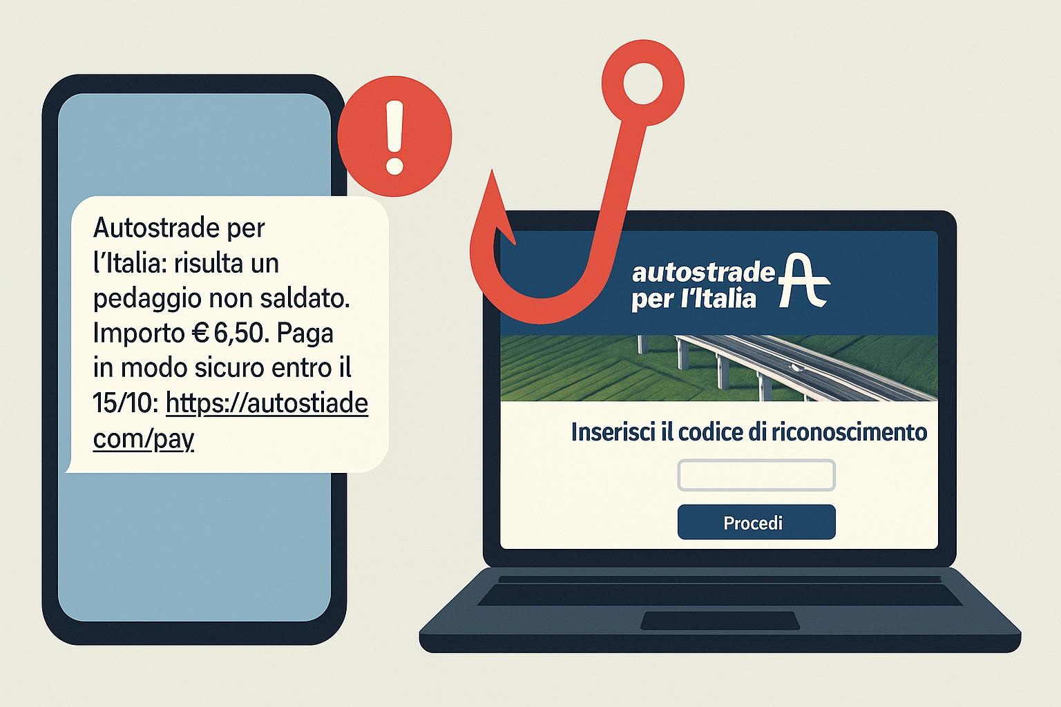 Il smishing, invece, si conferma in rapida crescita. I criminali informatici utilizzano messaggi SMS fraudolenti che imitano notifiche di servizi conosciuti, come banche o società autostradali. In particolare, una campagna molto attiva sfrutta il nome di Autostrade per l’Italia: il messaggio avvisa l’utente di un presunto pedaggio non saldato e invita a cliccare su un link malevolo. Questo link conduce al dominio “autostiade[.]com”, una copia quasi perfetta del sito ufficiale “autostrade.it”, frutto di una tecnica di typosquatting che si basa su errori di digitazione volontariamente indotti. Il sito fraudolento riproduce il logo e il layout ufficiale e chiede all’utente di inserire la targa del veicolo, il numero di cellulare e i dati della carta di pagamento. Tutte queste informazioni vengono immediatamente inoltrate ai truffatori, che le usano per realizzare frodi finanziarie e furti di identità.