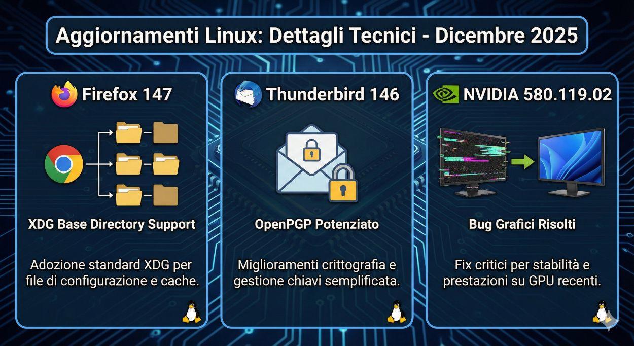 L’ecosistema open source riceve una spinta significativa con il rilascio simultaneo di aggiornamenti Linux cruciali per le piattaforme desktop. Firefox 147 entra in fase beta introducendo finalmente il supporto nativo per la specifica XDG Base Directory, ottimizzando la gestione dei file di configurazione su sistemi Linux. Parallelamente, Thunderbird 146 rafforza la sicurezza delle comunicazioni con una nuova interfaccia utente dedicata alla gestione dei keyserver OpenPGP e la migrazione delle credenziali verso la crittografia AES. Sul fronte hardware, NVIDIA rilascia il driver 580.119.02, una patch essenziale che risolve gravi problemi di corruzione grafica su monitor LG Ultragear e ripristina modalità video precedentemente interrotte. Questi sviluppi, previsti per il rilascio stabile il 13 gennaio 2026, segnano un passo avanti nell’usabilità, nella sicurezza e nella stabilità per professionisti e sviluppatori.