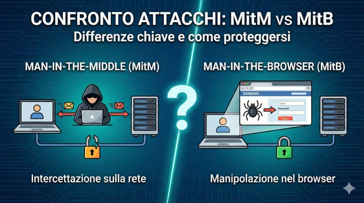 La differenza sostanziale è il punto di attacco: il Man in the Middle intercetta i dati mentre viaggiano sulla rete tra utente e server, mentre il Man in the Browser infetta il dispositivo dell’utente e manipola i dati direttamente all’interno del browser dopo che sono stati decifrati.