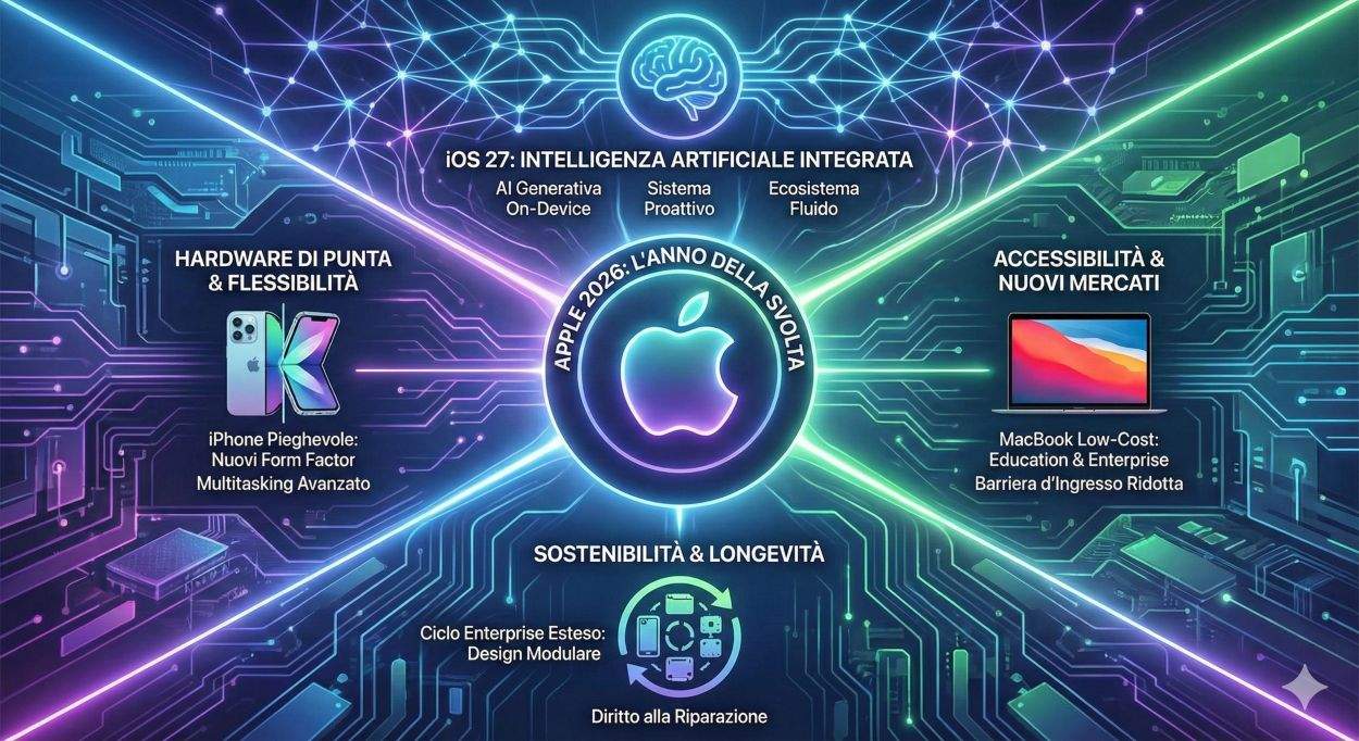 Apple si prepara a un 2026 di svolta che potrebbe ridefinire il posizionamento dell’azienda su più fronti, dall’hardware di punta al software intelligente, fino alla sostenibilità dei dispositivi nel ciclo enterprise. Al centro dei piani emergono un iPhone pieghevole, una nuova linea MacBook low-cost, e un’evoluzione profonda dell’intelligenza artificiale integrata in iOS 27, segnando una transizione strategica verso un ecosistema più flessibile, modulare e orientato alla longevità.